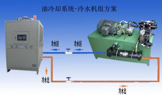 下面的方案就是選用工業(yè)冷水機(jī)組來(lái)冷卻油溫,工作流程示意圖請(qǐng)參照以下圖片示例: